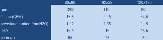 Come si vede dalla tabella la ventola da 92mm è quella con maggiore pressione statica e pertanto più adatta all'utilizzo su un dissipatore, mentre le altre due sono più consone alla ventilazione dei case.